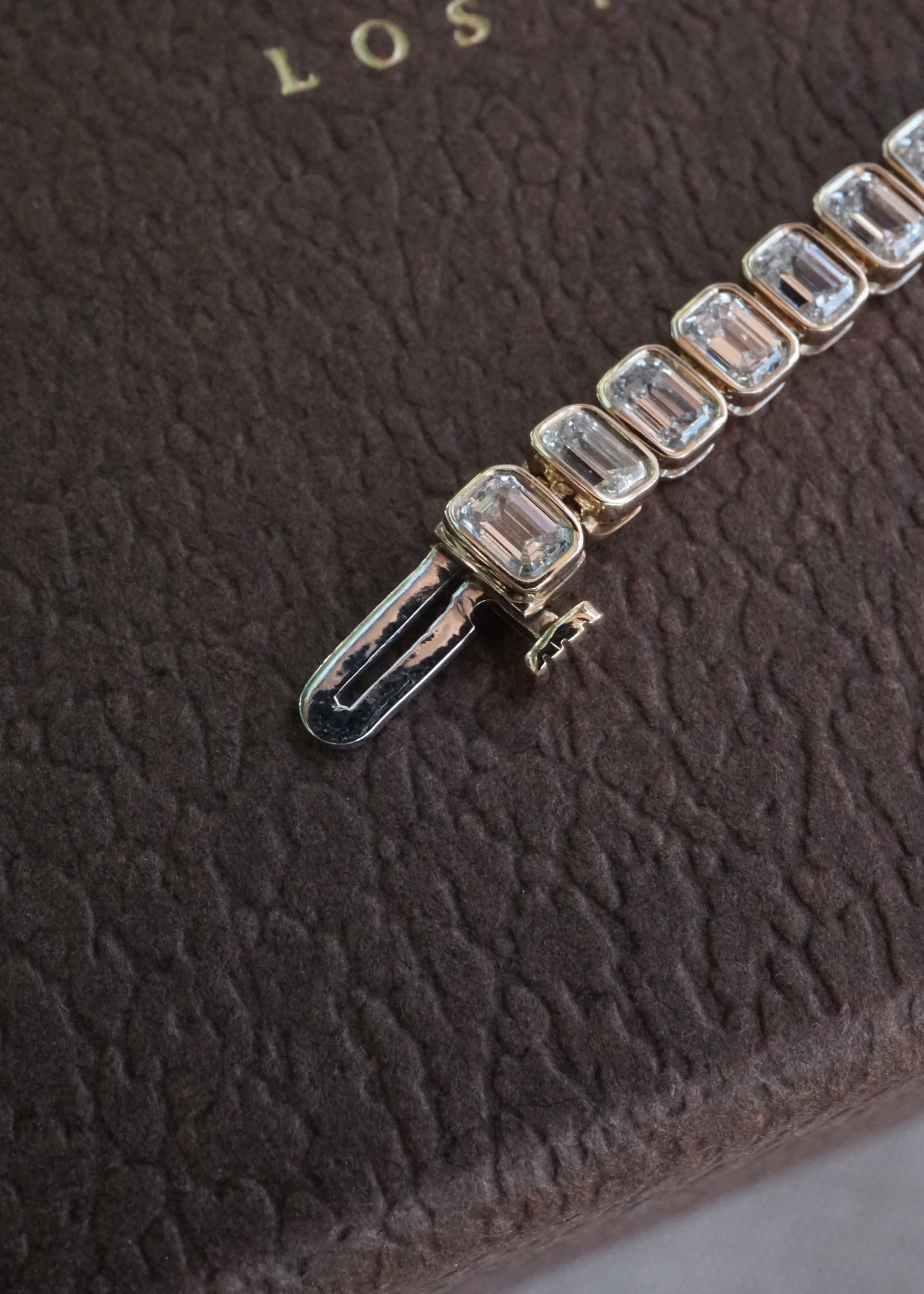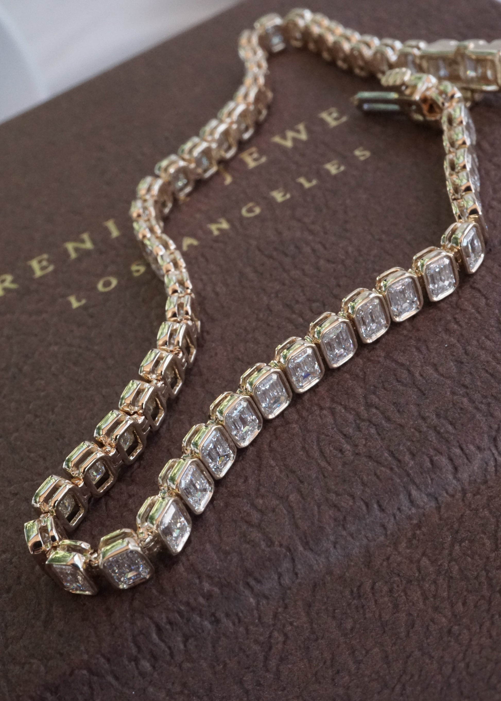 This bezel-set emerald cut diamond tennis bracelet captures the perfect balance of strength and elegance. Each emerald-cut diamond is precisely framed in smooth 14k gold, enhancing its clean lines and mirror-like brilliance — creating a look that’s both modern and timeless.