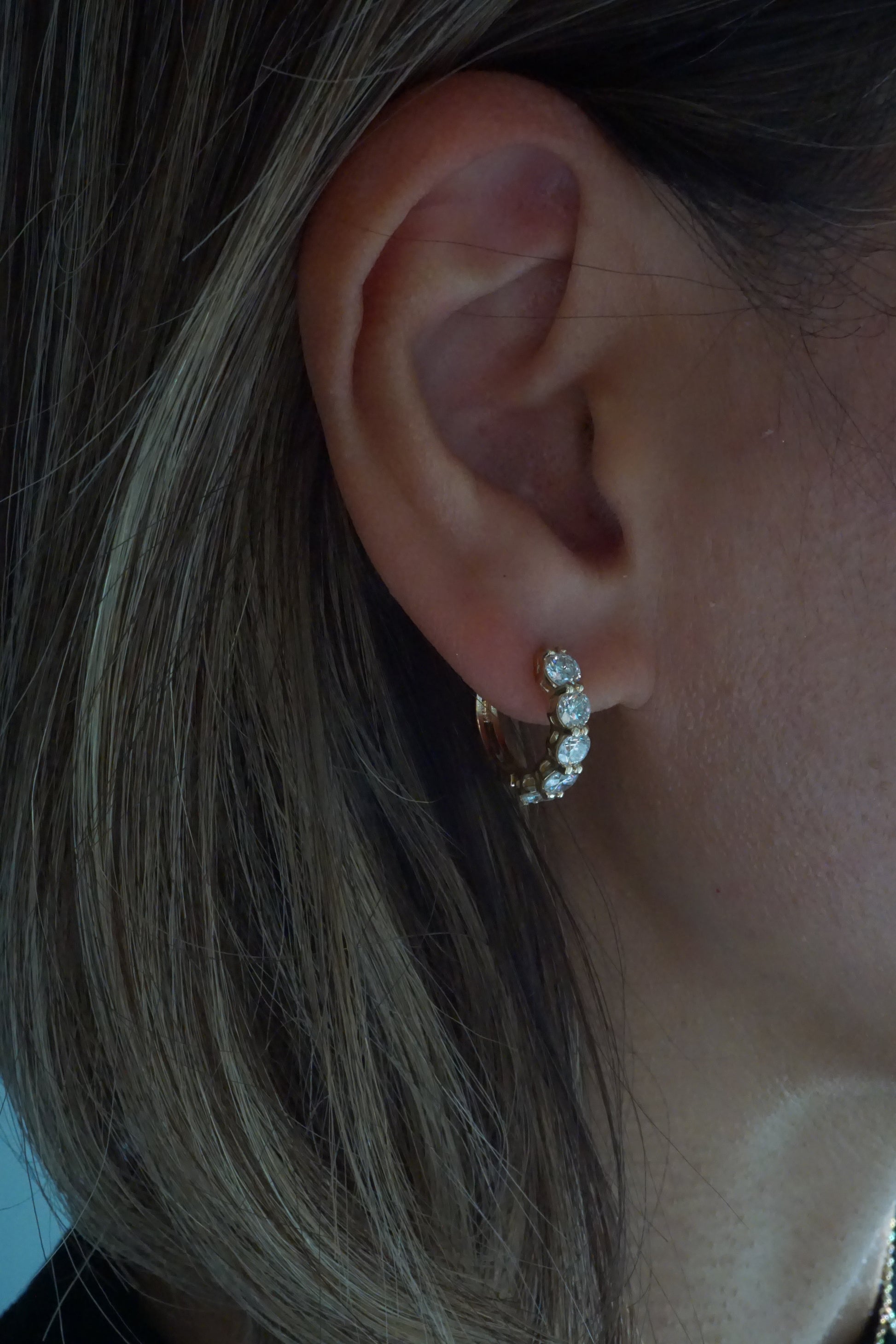 These shared-prong diamond huggies feature hand-selected stones placed closely together, creating a seamless row of sparkle that lights up with every angle.